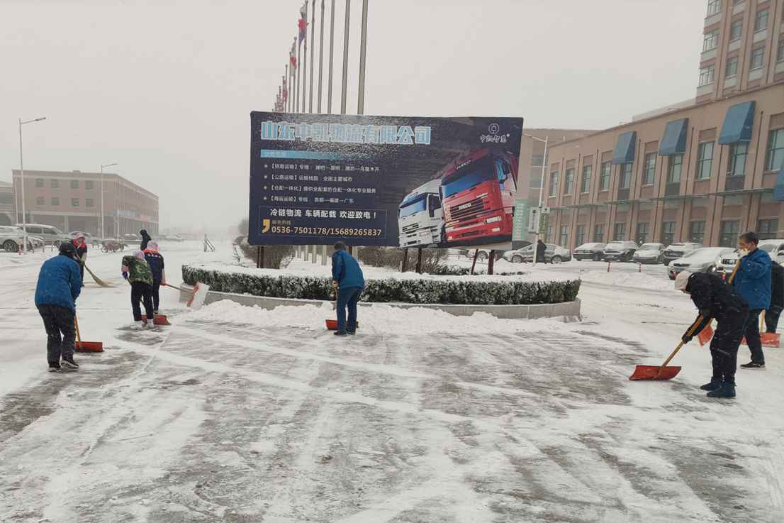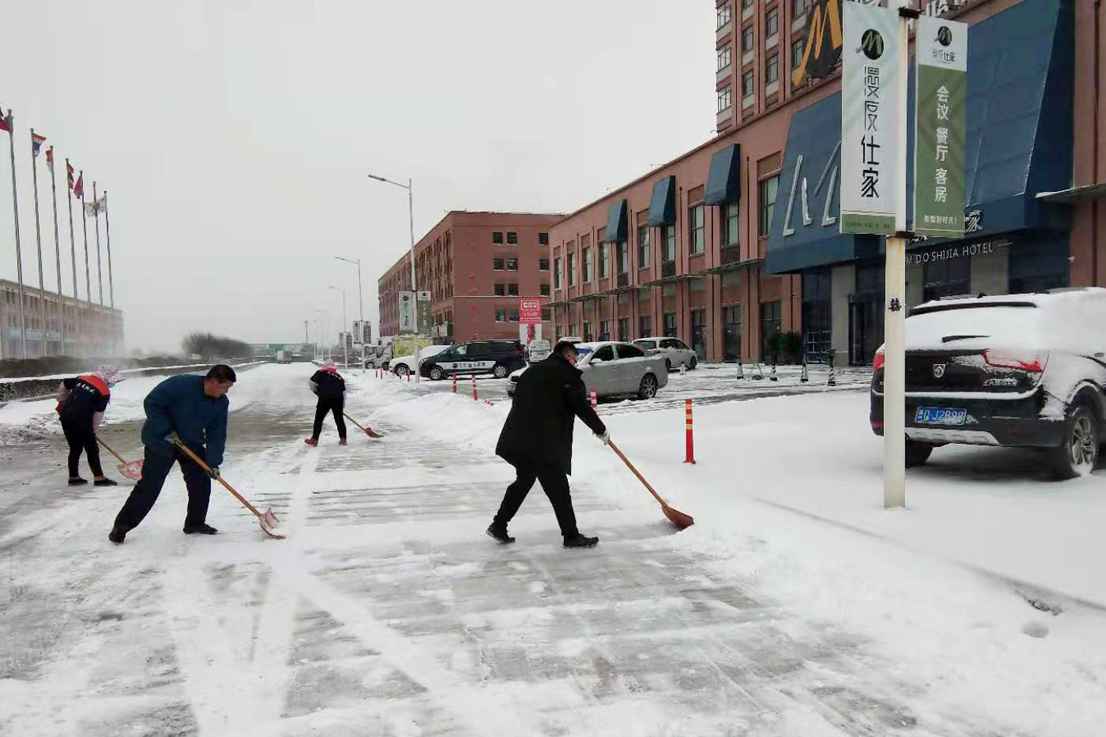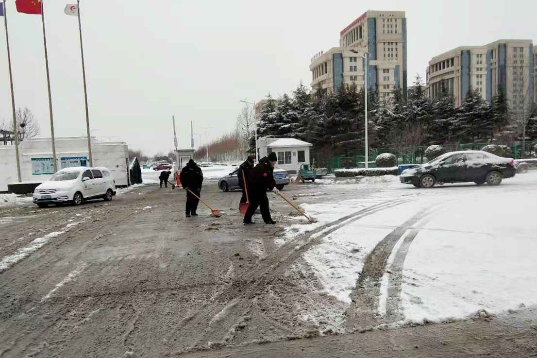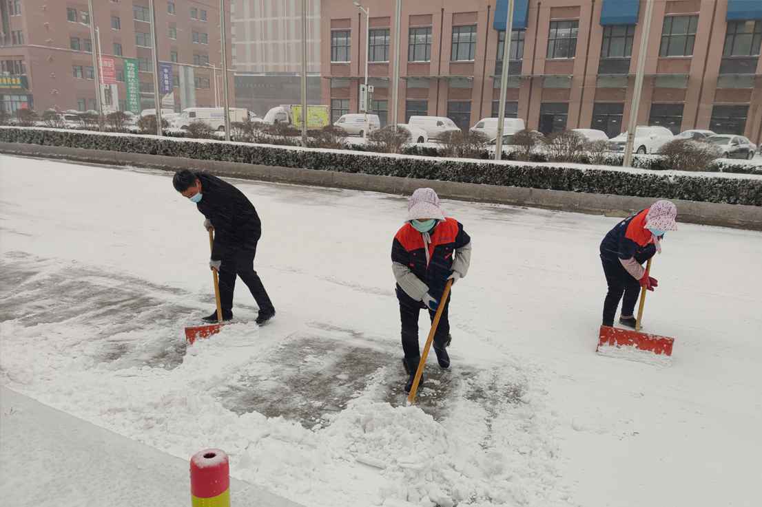 由于降雪较大,地面的积雪厚厚一层,只能铲雪板先行,再用扫帚和铁锹跟进,经过数小时的奋战,终于将园区的西门、北门、主干道、地下停车场入口、商务楼、一号冷链南门等路段的积雪清除完毕,最大
